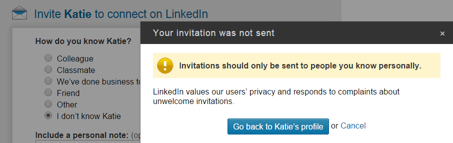 Note also the warning not to invite people you don’t know well. Although many of us ignore this so we can work LinkedIn to our advantage, it does involve taking a risk, as you discover when you click on “Find out why”. If the recipient indicates “that they don’t know you”, “you’ll be asked to enter an email address with each future invitation”. In actual fact, a number of site users will have to label your messages as spam or say they don’t know you before your account is restricted in this way.