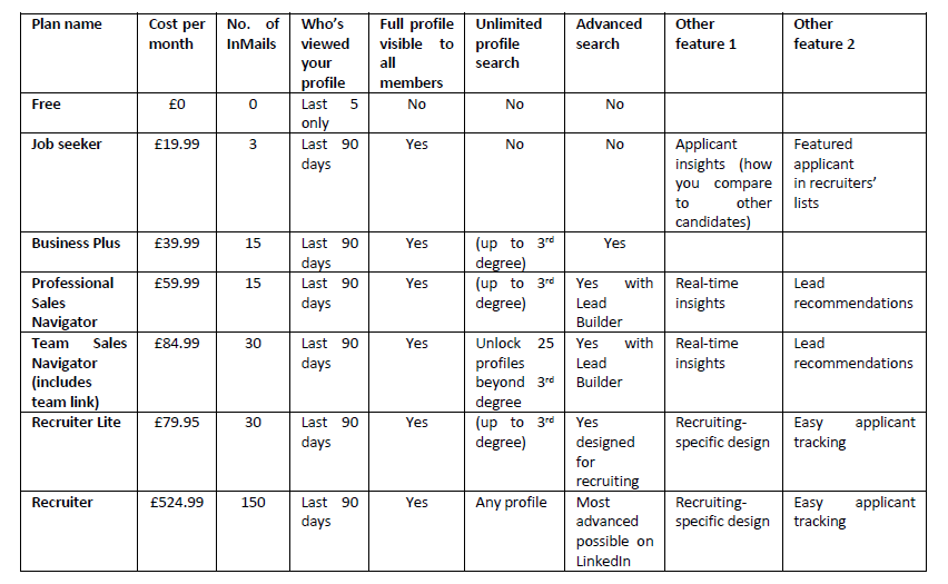 LinkedIn offers four main premium plans (Sales and Recruiter include enhanced versions) in addition to the free option the vast majority of us take advantage of. Below is a table demonstrating how they compare. And this short slide show also points out the major differences between premium and free profiles.